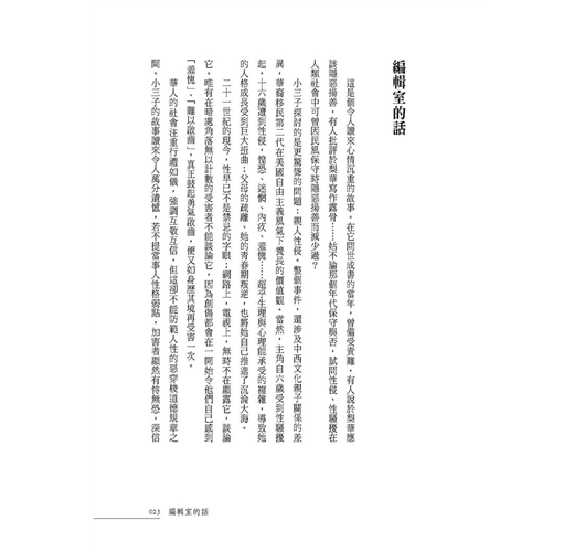 「她將關懷的筆觸,大膽地伸向了一個一直暗暗地存在著、但卻極少作家觸及的社會問題──近親的性侵犯。」