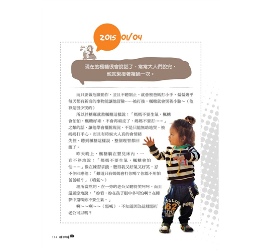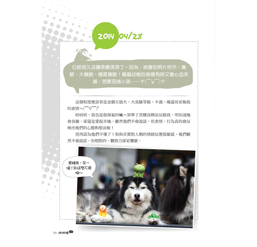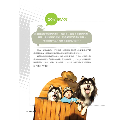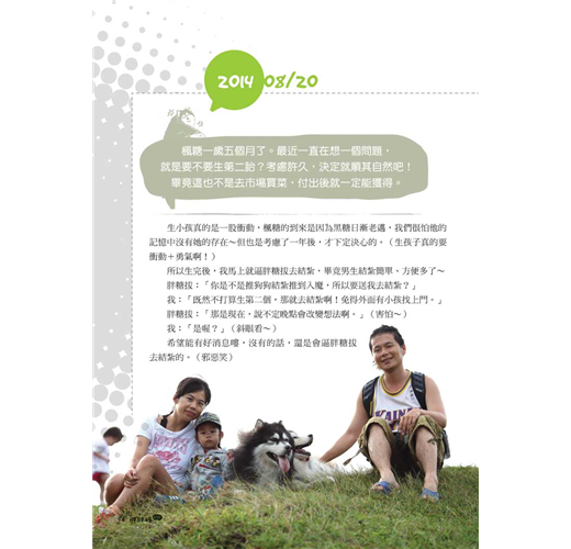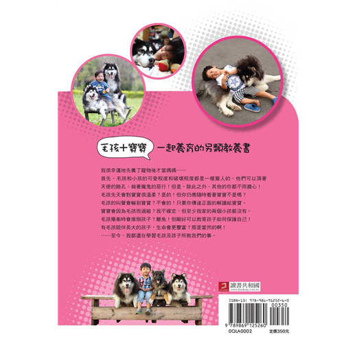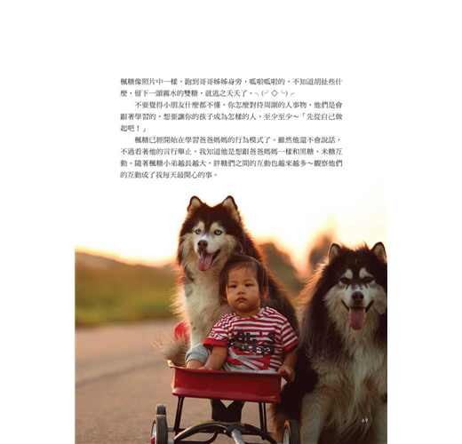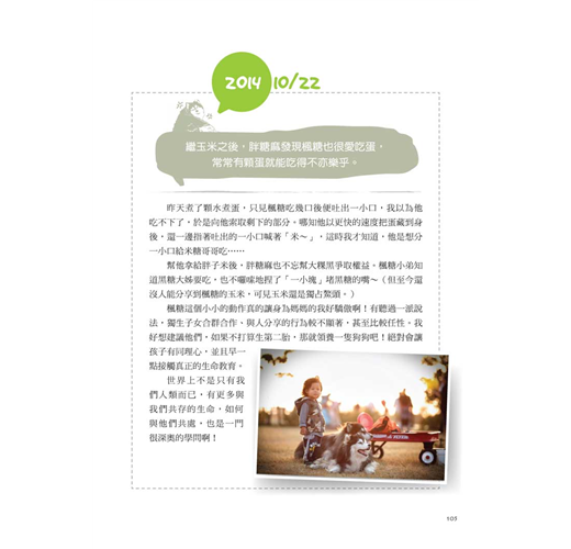 從小,看到路上的狗狗,都會害怕到繞道而行,覺得他們是無法控制的邪惡生物。如今,第一次寫書,目的卻在分享同時養育毛孩與小孩的美好經驗,並且希望不要再發生懷孕或小孩出生就把毛孩送走或棄養的憾事,以及推動「領養代替購買、結紮代替撲殺」的觀念。