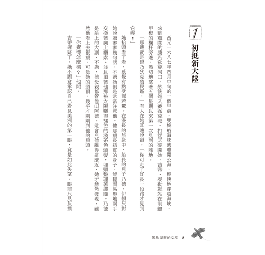 吉蒂一跳就越過船邊,雙腳踩上美洲的土地。她深吸一口氣,嗅到鹽分和臭魚的味道,接著東張西望地想找人分享她的興奮之情,可是大家都把她忘了。碼頭上有一群男人和小孩鬧哄哄地圍住了伊頓家三口,她聽見大家忙著探聽過去幾個月的大小消息,其他旅客匆匆沿著碼頭走到後面的泥土路上。附近只有三個衣著破舊的女人,可她實在按捺不住滿心的熱切,對她們露出微笑,打算聊幾句,只是她們強烈好奇的眼光,讓她打消了這個念頭。她抬起一隻手心虛地摸著一頭亂糟糟的棕色鬈髮。自己八成是一副狼狽相!沒戴手套,沒套髮網,一張臉被幾個星期以來鹹鹹的海風吹得又紅又粗。但她們怎麼可以這樣沒禮貌地瞪著她呀!她拉起大紅色斗篷的帽子轉頭走開了。對吉蒂來說,尷尬是一種全新的感覺。在故鄉的島上,可沒人敢這麼盯著法蘭西斯‧泰勒爵士的孫女!
