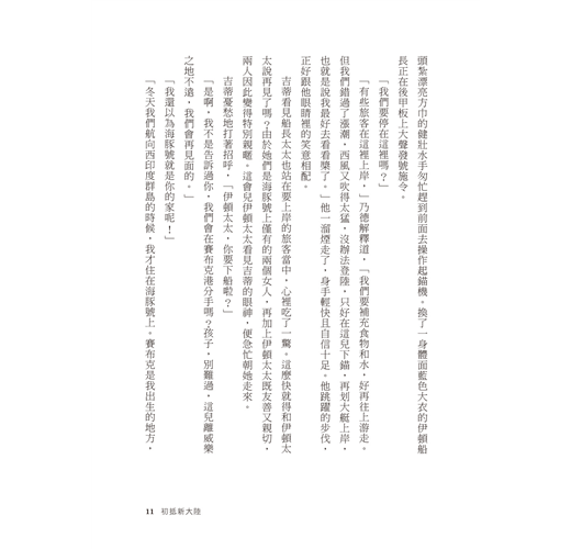 「吉蒂,多孩子氣呀!」伊頓太太微笑道,「有時候真難想像你都十六歲啦!」她徵求先生的同意,只見伊頓船長蹙著眉,看看女孩被海風吹紅的臉頰,和一對閃亮的眼睛,這才聳聳肩膀,算是答應了。吉蒂撩起笨重的裙子,爬下搖晃的樓梯時,大艇上的男人都禮貌地把行李靠攏,讓個空位給她。大艇划開海豚號的船身那當兒,她的心情有如港口的白浪一樣上上下下。