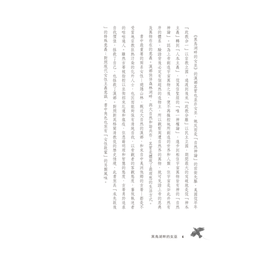 《黑鳥湖畔的女巫》的漢娜其實也並非女巫,她反而是「自然神論」的前衛先驅,美國從早年「政教合一」以宗教立國,過渡到後來「政教分離」以民主立國,期間最大的突破就是從「神本主義」轉到「人本主義」,從篤信聖經的「唯一神權論」,進步到相信宇宙萬物皆有神的「自然神論」。認為上帝創造宇宙萬物之後,便不再操控祂所創造的世界和人類,但宇宙是如此井然有序的體系,驗證背後必定有個超然的造物主,所以觀察周遭自然界的萬物,就可見證上帝的恩典及萬物存在的意義。漢娜倘佯森林湖畔,與大自然和諧共存,其實體現了最理想的生活方式。