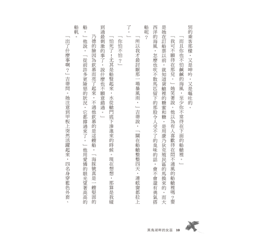 原來他注意到了!她覺得好驕傲,證明了自己是個天生的水手。旅途中,她可沒像別的乘客那樣,又是呻吟,又是嘔吐的。