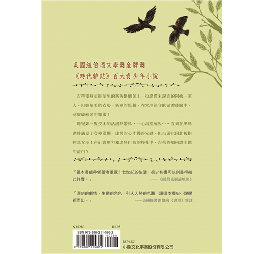 文字彷彿被下了女巫的魔咒,一翻開此書,目光便難以離開。看著吉蒂在清教徒的阿姨家努力工作,尋找生存空間;看著她在威廉熱情的目光下,以為嫁給他便能擺脫困苦;也看著她投入大草原的懷抱,與傳說中的女巫成為好友……直到皆大歡喜的結局,才能讓人滿足地闔上書頁。