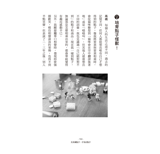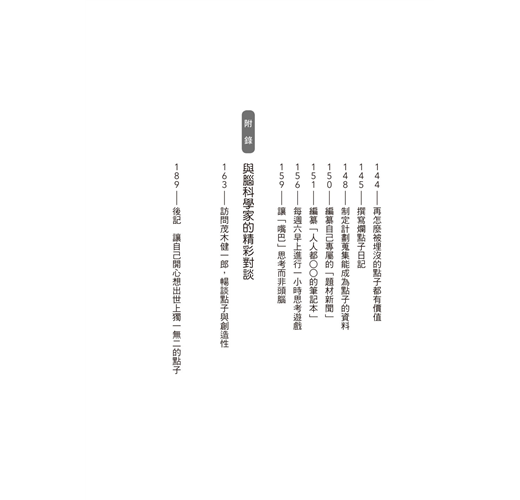 ◢ 激發腦部活性有助構思日本知名腦科學家茂木健一郎,也以相關學理證實,點子會從組合的過程中誕生。不斷訓練自己,將各種事物隨機結合成具有生命力的東西,就能創造成功的點子。此外,腦科學中還提到「預設模式網路」(default mode network)的概念,找到適合思考點子的環境,經常放鬆身心,激發腦部活性,任何人都能培育腦中的點子怪獸。