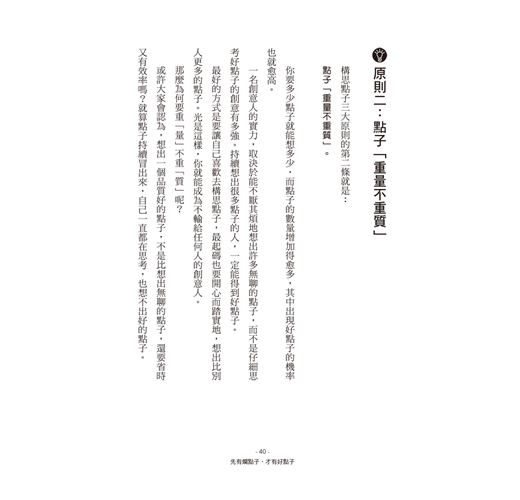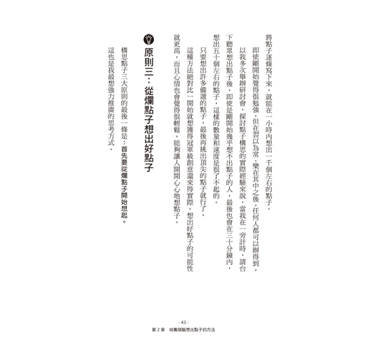 真正有實力的創意人,必須不斷構思新點子。點子想得愈多,好點子出現的機率愈大。如同選美比賽,一千個人當中選出來的冠軍,一定比五百個人選出的冠軍還要來得厲害!