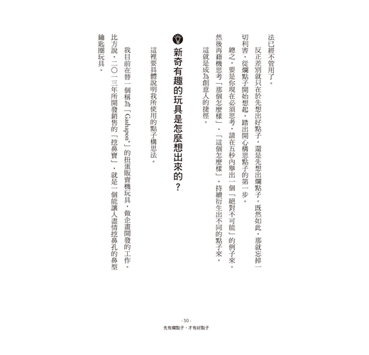 然而,儘管到目前為止我讓五十種以上的玩具面世,但點子卻不是接二連三地冒出來,也不是輕輕鬆鬆就能不斷做出新產品。