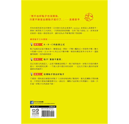 ──高橋晉平扭蛋販賣機的黃金企畫高橋晉平,從事玩具企劃開發十年,創造許多饒富創意的玩具,累積多達五十種設計商品問世,知名作品有:手機裝飾「嘟嘟美唇」、提醒主人不要駝背的「駝背貓」,以及獲得玩具大獎殊榮的「無限擠泡泡」等,掀起日本、台灣各地一波又一波的扭蛋收藏熱潮。但你知道這些新奇有趣、讓人大開眼界的玩具,竟是從無數個「爛點子」發想出來的嗎?