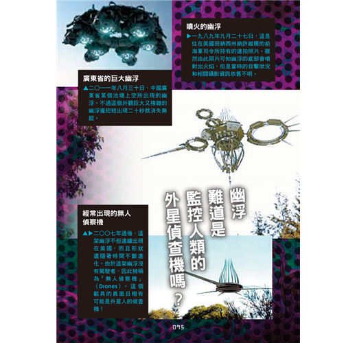 沒有機翼結構的幽浮,常以各式形狀出沒於地球中,圓盤形、球形、不規則形……共六大外觀。深入剖析每一種類,帶你探究宇宙人飛行載具的多樣性!