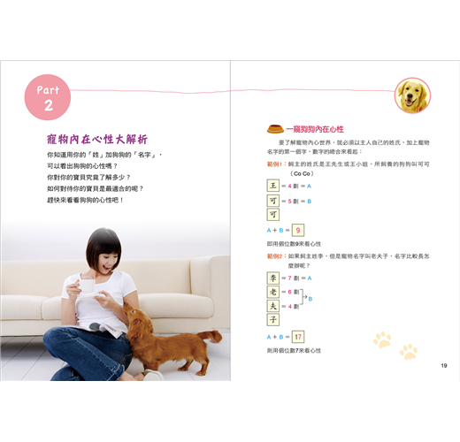 書中提供6個真實案例,以及對應的姓名學和數字靈數分析,透過真實案例的輔助說明,能讓讀者更清楚如何實際應用。書後並附上繁簡體字對應的筆畫,方便對照使用。此書淺顯易懂,應用簡單,愛狗人士千萬不要錯過!