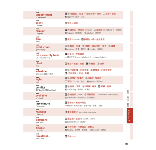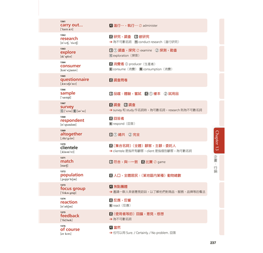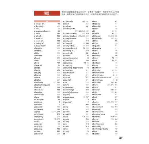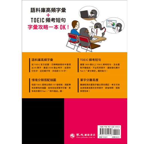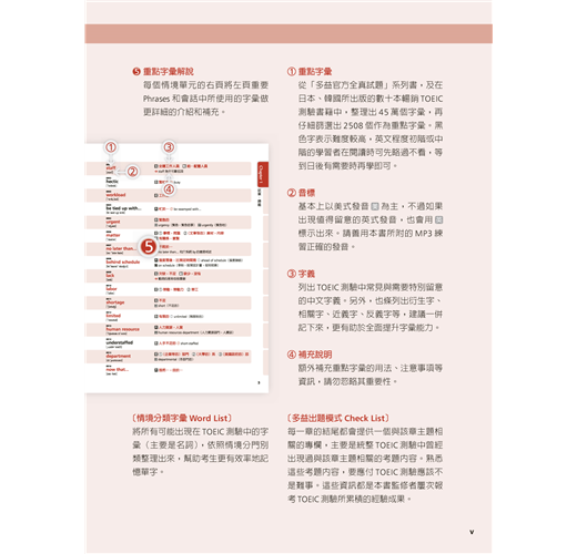 從TOEIC官方試題、日韓暢銷教材中整理出45萬個字彙,嚴選2508個必考字彙;並提供衍生字、相關字、近反義字等,總共收錄5170字。