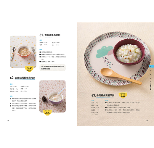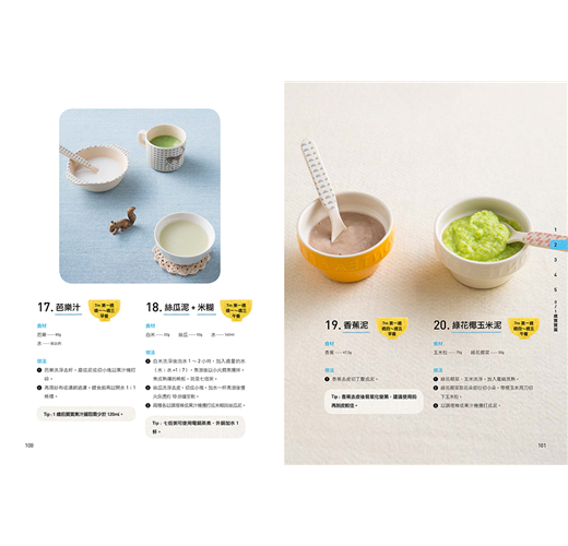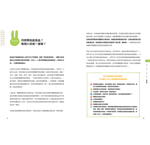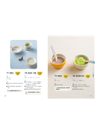 本書菜單先為厭奶及食用配方奶的5個月大寶寶開始做設計。寶寶5個月大可以開始品嘗食物的味道,第一個月以少量循序漸進,用湯匙或杯子讓寶寶學習吞嚥,可由米湯、米糊開始,再慢慢漸進至果汁、果泥、蔬菜泥……等,每種食物嘗試量約為1~2茶匙(5~10克),適應後再慢慢增加食物量與稠度,每種食材至少測試3~7天,觀察寶寶是否會過敏。副食品可在寶寶想喝母奶或配方奶之前給,品嘗副食品後再給予母奶與配方奶,且用量須依據寶寶個別的食慾及成長狀況做調整,最好在白天嘗試副食品,好讓爸媽觀察寶寶是否會過敏。