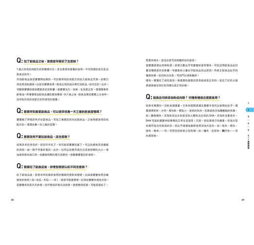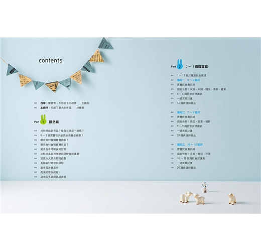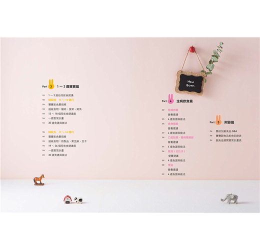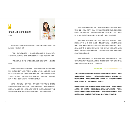 本書以5個月厭奶餵配方奶的寶寶,開啟5個階段的營養建議,第一階段5~6個月是寶寶副食品初體驗,第二階段7~9個月慢慢增加食物種類與食量,第三階段10~12個月隨著寶寶成長,慢慢建立食物份量的概念;第四階段13~18個月開始以固體食物為主食,第五階段19~36個月慢慢銜接上大人飲食。