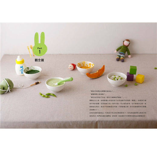 這本書從一個營養師的角度出發,提供爸媽們營養建議。不同階段寶寶所需要的營養量、烹調方式是不一樣的,希望能讓新手爸媽得到嬰幼兒營養相關正確的知識。在實際烹煮部分,也會提供一週買菜食譜,從採買食材、切菜、烹調方法一次備齊,讓爸媽可以在家簡單烹煮,製作安全、健康又美味的副食品。