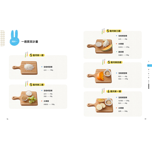 每個階段以一週買菜菜單,循序漸進提供寶寶每日所需的食物份量,配合饗在家團隊的大廚實做,呈現一道道食譜,希望能讓細心的父母了解食物如何處理與烹調,不致手忙腳亂,並在烹煮過程中慢慢建立食物份量的概念。食譜中所提供一道菜的食材,也可以其他同種食材替換,讓寶寶體驗更多種不同食物,建立不挑食良好的飲食習慣。