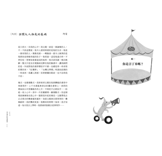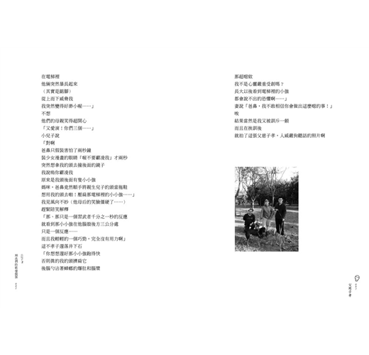 像導演布置著光影翻動,栩栩如生,影像流動的一切。我總是跟那麼小的他們說:「睜大你的眼睛,好好觀察發生的一切。」我帶他們在夜市,丟著螢光橘的乒乓球,它們在不同高度彈跳著,有某顆掉進計分的玻璃杯,大部分是無效的失去彈力滾進最後頭的槽溝;或是廉價塑膠飛鏢甩向灌飽水的七彩氣球,有的會射中迸撒出水花,大部分是寂寥的墜地,或釘在木板。那就像有一天會從你們手中流失的回憶,大部分被遺留在那麼小的你們的「此刻」,無法帶到長大以後的未來。那些光影畫面會像碎玻璃飛離你們。我也是如此,我如今記得六歲以前的某幾個畫面,都是八歲,十歲,十一、二歲,某次偶然回想,或當時聽父母兄姊說起,似乎有那麼回事,然後像駱駝攜帶水壺,一段一段載運給下個階段的自己。而記得的,其實少得可憐。