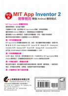 MIT App Inventor 的相關功能都有介紹,包括:程式邏輯所需的拼圖塊、 各種不同用途的元件(User Interface 元件、Layout 元件、Media 元件、 Drawing and Animation 元件、Sensors 元件、Social 元件、Storage 元件、 connectivity 元件),但不含LEGO® MINDSTORMS® (控制樂高機器人)元 件。