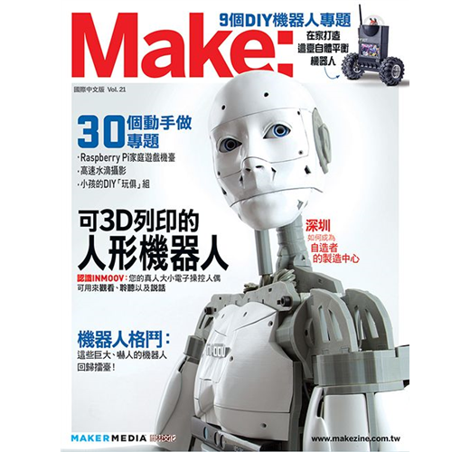 本期中會介紹幾款人形機器人。其中有InMoov人形機器人,這是一個全球性的專題,自造者共同努力的成果,結合了可3D列印的元件、通用電子元件和開放程式碼計劃,功能強大,可以說話和做動作回應聲音指令。其他還包括如何逐步打造自主導航、自我平衡的機器人,導入尖端機器人研究成果的「張拉整體結構」(tensegrity)震動機器人,以及突破傳統機械手臂限制的機械圓臂。