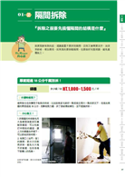 彙整拆除、水電、鋁窗、泥作、空調、木作、系統櫃、油漆等16個工程項目的費用總整理,方便讀者查閱每一個項目的價位是多少。