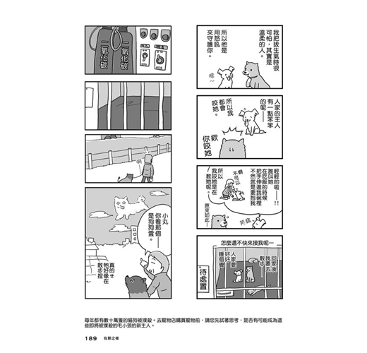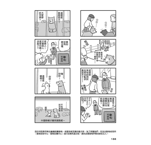 ★本書也是適合親子共讀的生命教育讀本,最終篇「動物收容所」,描繪遭棄養的狗狗,仍忠誠地思念等待飼主,令人不捨的圖文,間接喚起對生命的愛與尊重。