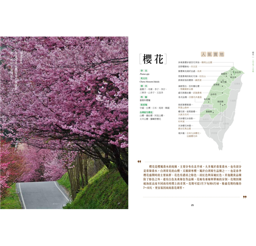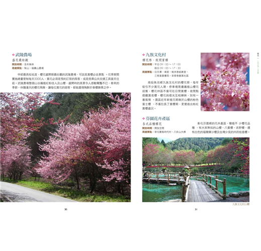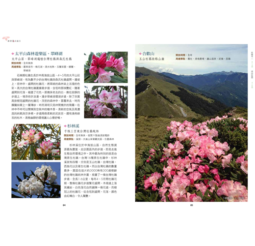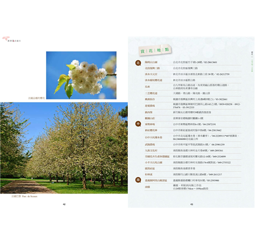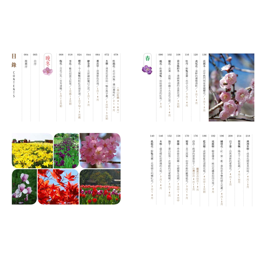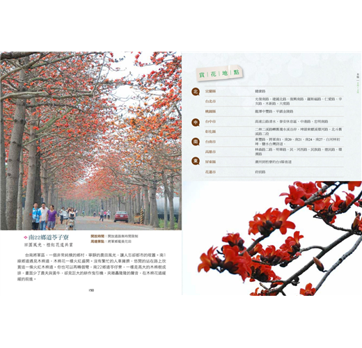 按照時間依序介紹1月~5月當季花卉,並且一一列出人氣最旺的景點,從國家公園到街道路段,從平地都市到深山部落,從休閒農場到私人林園,多樣選擇可依不同需求安排。每個推薦賞地還附有開放時間與周邊景點,更方便規劃行程,現在就拿起行事曆畫出這季的賞花日程吧!