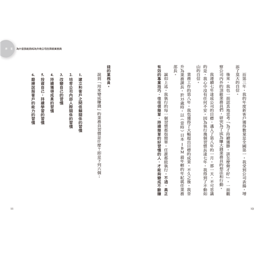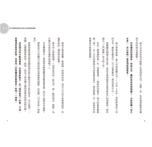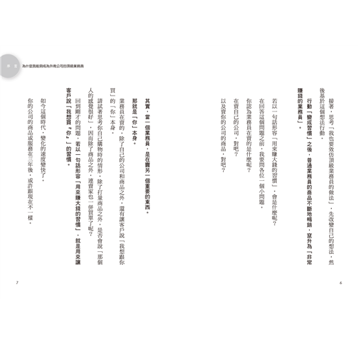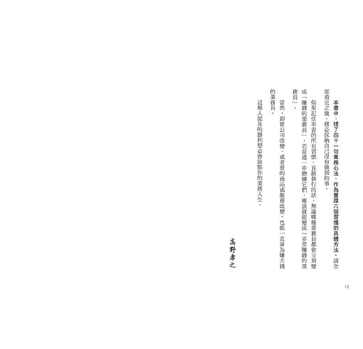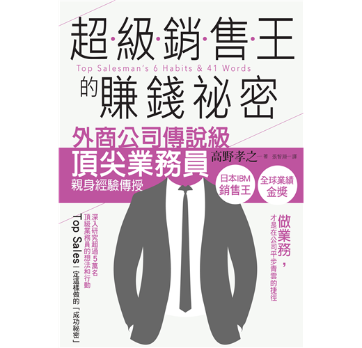 「不必想得太複雜,跟著正確的業務方法做,小業務也能不斷賣出商品,晉身賺錢的業務員;一個懂得賺錢的業務員,即使公司、賣的商品或服務變了,也能夠讓客戶說『我想跟你買』,成為一直非常賺錢的頂尖銷售員。」──高野孝之