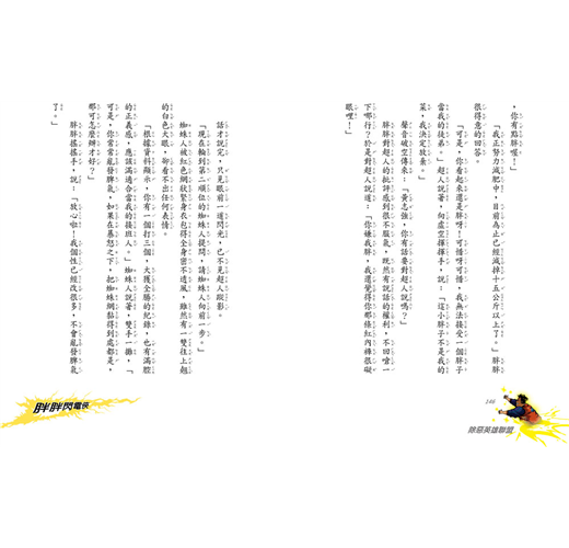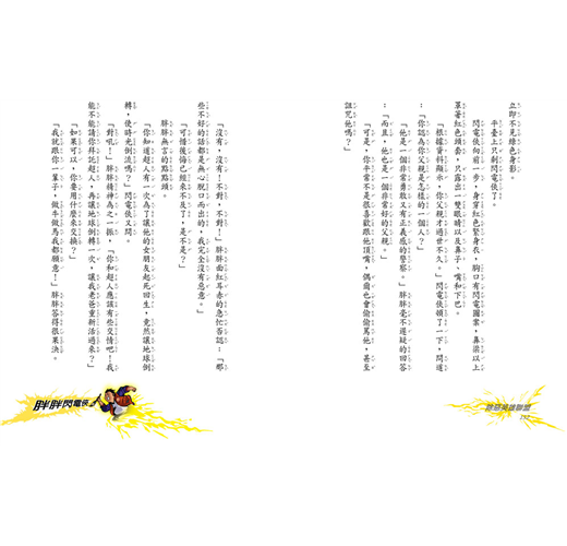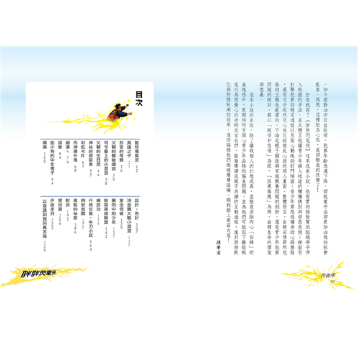 於是我寫了《胖胖閃電俠》這本成長小說,很寫實的揭發幫派組織將手伸入校園的手法,並具體呈現讓青少年誤入歧途的種種誘因與邪惡伎倆;裡面有打擊犯罪的精采過程以及驚心動魄的打鬥場面;有少年罪惡感纏身的心路歷程,還有父子坦然交心後化解彼此心結的感人畫面。整體而言,由精采情節所包裝的主題是嚴肅的,不論是親子關係與家庭教養問題的剖析,還是青少年犯罪問題的探討,都以「親情和友情」為經,「因果報應」為緯,詮釋生命的價值與意義。