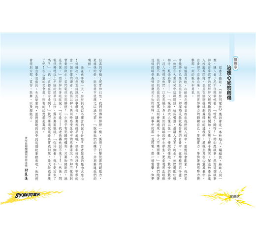 爸爸出事那一天,胖胖到底口不擇言的說了什麼?作者製造的懸念太虐心!好幾次,我想直接跳到故事最後,讓真相提早出現,但幸好我沒有!乖乖的當一個自律的讀者,我得以和主角同時感受生命中的悲喜浮沉,不知不覺得到寶貴的啟示。當閃電俠安慰胖胖:「小孩子有犯錯的權利,只要知錯能改,就是天使。」而胖胖紅著眼眶說:「可是……我老爸再也回不來了!」然後,閃電俠將遮住上半臉的頭罩往上拉,露出真面貌說:「你仔細看,我不是回來了嗎?」「我一直都在你身邊啊!」就不要追究這是真實或幻想,是天啟或夢境了吧!在心靈的交會處,所有的幻想都是真的。