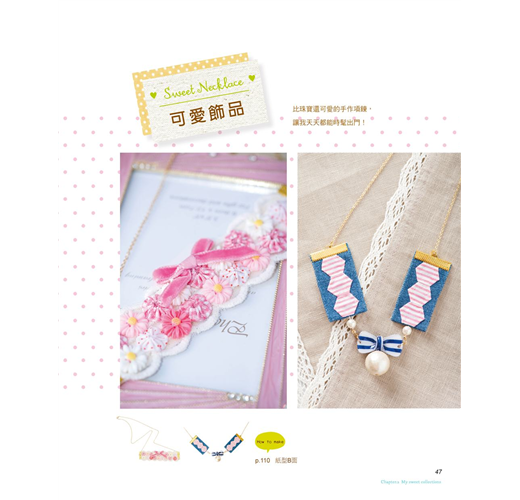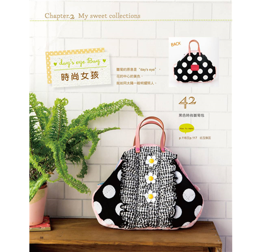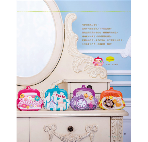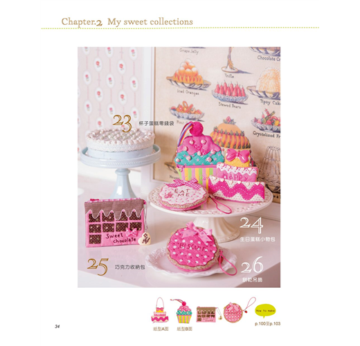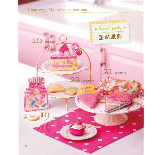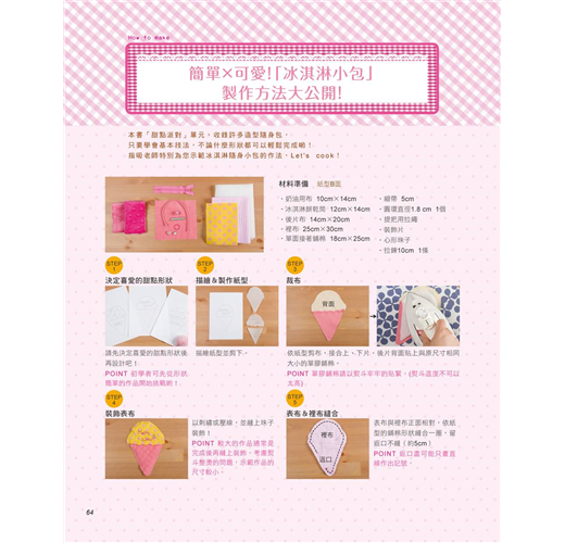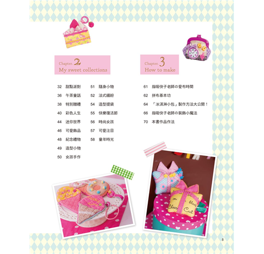這回指吸老師還在書中介紹她最愛用的布料、裝飾小物,教大家如何將平時收集的小雜貨,自己改造變身為作品上的裝飾好物,並且詳細示範甜點造型零錢包的製作流程,只要學會基本作法,就能自行運用在其它造型的作品上,即使是初學者,也可以輕易上手喲!