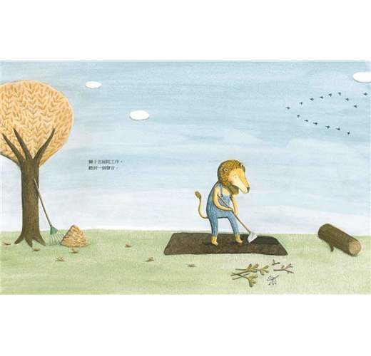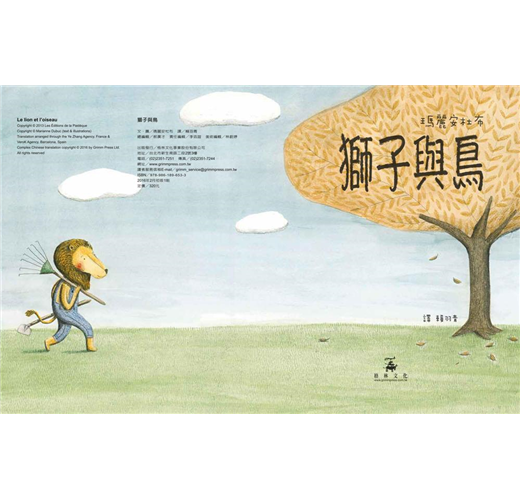 瑪麗安杜布的《獅子與鳥》是一部罕見的精美作品──她用溫柔又充滿旋律的故事歌頌生活的瞬間,一隻獅子在秋天的花園裡找到受傷的鳥兒,並照料他直到他能飛翔,在這段「幫助」與「被幫助」的關係裡,他們因寂寞而彼此慰藉,卻建立起一段美好的友誼,那同時也是一種寧靜而深刻的回報。