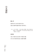 台北城是我喜愛的一個人間世。其樓宇其街巷,其城市邊緣的山崚與天空,其糾結難分的市廛與汔笛,彷彿有我的前生。台北城有詩歌,有浪蕩其間的詩人,有詩的場景與舞台,有詩歌的捷運與步道,更有無數優秀的詩歌本子。那是一盆孕育生命的水,可以讓詩人泅泳而不沾污其魂魄。