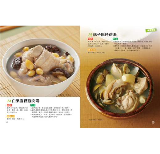 很多人一定會認為只要是燉補類的料理,就會覺得很繁瑣複雜,嫌麻煩而到外頭店家購買。其實許多養生食材、藥材在超市或是中藥行都可買得到,本書用電鍋或電子鍋簡單又方便的方式,並調配好材料,回家只需要丟進電鍋電子鍋中一起煮,不用半小時就可輕鬆享用,自己在家也能做出養生食補的健康料理。