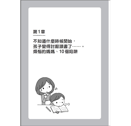 第1章,以提示的形式介紹會使孩子落入討厭讀書狀態的陷阱,讓媽媽們能夠反思自己的行為方式。