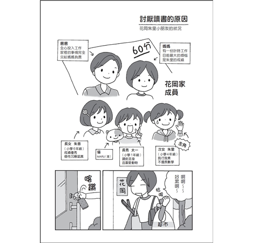 因此本書的第1章,以提示的形式介紹會使孩子落入討厭讀書狀態的陷阱,讓媽媽們能夠反思自己的行為方式;第2章則是從反方向思考,說明是爸媽的那些習慣行為能夠讓孩子變得喜歡讀書;而第3章,繼續為各位介紹具體的實踐方法,告訴爸媽們要如何實際建立孩子的讀書習慣;最後的最後,第4章將會統合本書所提過的要訣與規則,從親子之間的日常生活習慣與對話習慣進行統整,以建立自主學習習慣的良好基礎。