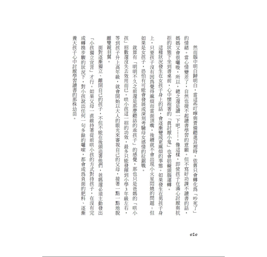 喃喃唸誦這些咒語的正確場合,不在孩子的面前,而是各位現在正在做的、閱讀這本書的時候,才是最正確發動咒語的時間。是的,本書的希望正是媽媽們能夠在稍微緩一口氣的獨處時光中,思考一下、對自己進行反問:「從以前到現在,我對孩子的教育方法是正確的嗎?」
