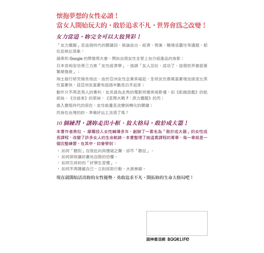 本書作者泰拉.摩爾投入女性輔導多年,創辦了一套名為「敢於成大器」的女性成長課程,改變了許多女人的生命軌跡。本書整理了她這套課程的菁華,每一章就是一個完整練習。在其中,妳會學到: