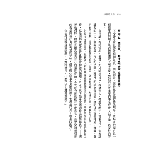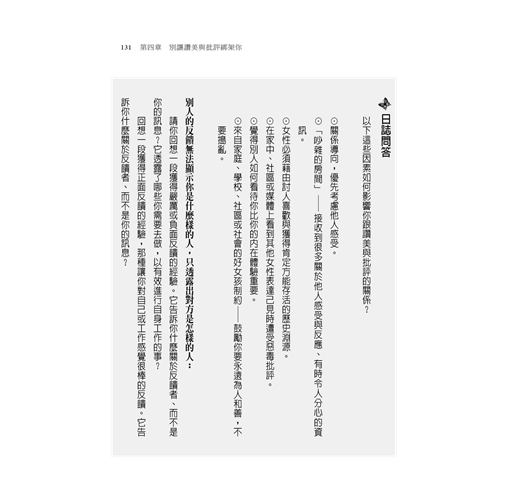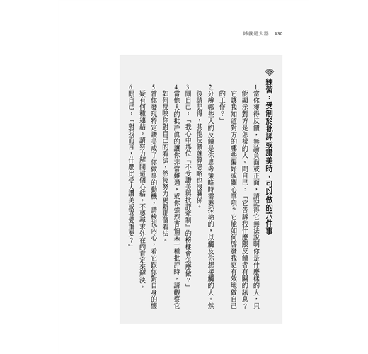 在每一章的末尾,你都有機會把學到的概念用在生活上,並藉由練習與日誌問答來實踐。我知道你很忙,所以這些練習都可以在數分鐘內完成,不必花費額外的時間。它們是針對你會遇到的挑戰,提供一種新的思考與處理方式。