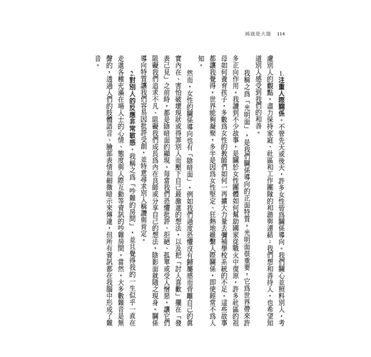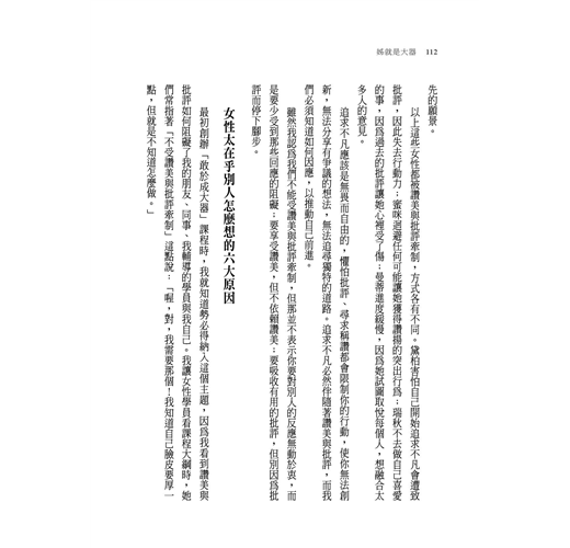 「敢於成大器」不是要你在陳腐的體制中往上爬,而是學習運用自己的聲音來改變體制。不是要你依照當前社會認為女性該做或不該做什麼事的思維來做選擇,而是擺脫狹隘的標籤,把注意力重新集中在自己的渴望與夢想,在築夢的過程中敢於不凡。