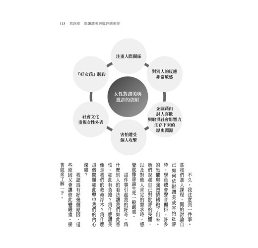 接著我們會談到如何不受稱讚與批評的牽制。依戀稱讚、逃避批評將阻礙我們去做創新且富爭議的工作,只去關心周遭的人是否理解或同意我們的做法。很有能力的女性常遭到充滿敵意的批評,因此我們需要學習如何承受批評,不被批評擊倒。我們也需要學習解讀別人的反饋,好讓這些意見推動我們向前,而不是傷害我們或讓我們動彈不得。