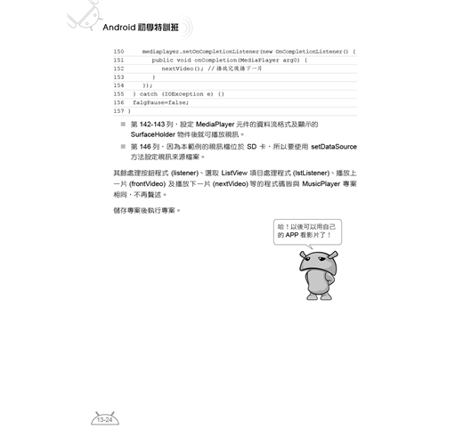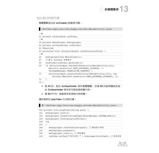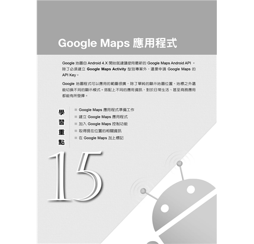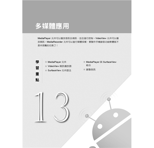 ■多元的應用主題:如檔案資料處理、資料庫、時間服務、圖片、音訊、視訊、多媒體應用、Google Maps應用程式開發、Android模擬器使用,以及上架Google Play商店。