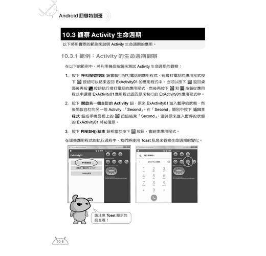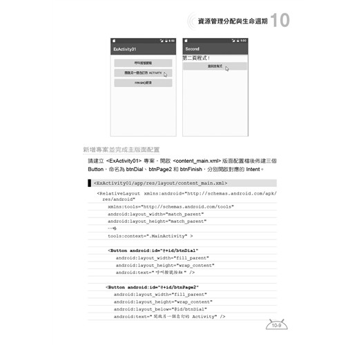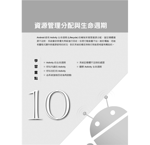 ■重要的開發技巧:深入了解程式運作,包含Intent、資源管理分配、生命週期,以及利用相關工具加速並改善開發流程,詳細解說自動完成功能與除錯工具。