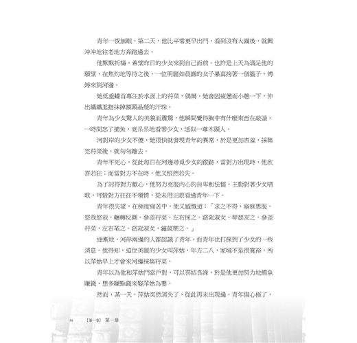 青年懊惱地看著少女漸行漸遠,開始期待起明天的相遇。當天晚上,他輾轉反側,腦海裡不停想像那少女的模樣,情到深處,情話不由得脫口而出:「關關雎鳩,在河之洲。窈窕淑女,君子好逑。參差荇菜,左右流之。窈窕淑女,寤寐求之。」