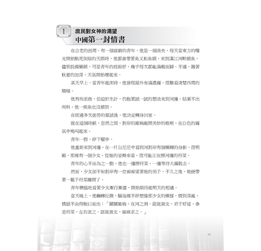 然而,青年的痴情和他的詩歌一樣,在人群中流傳開來,並在春秋時期,被儒學祖師孔子取名為《關雎》,收錄進先秦三百首詩歌集─《詩經》中,成為開篇第一首詩。