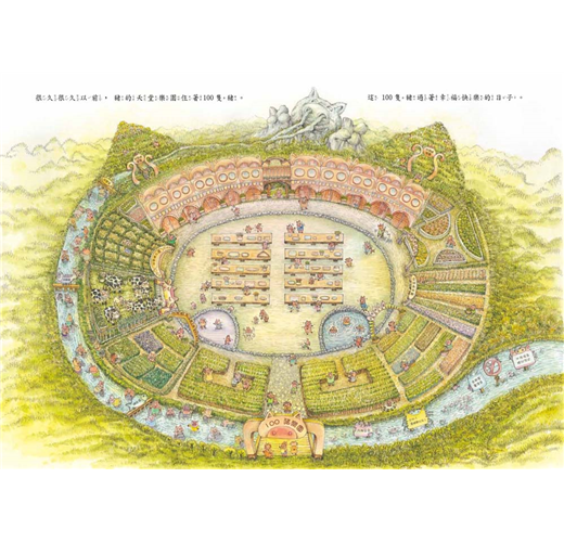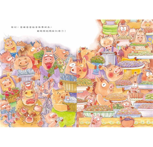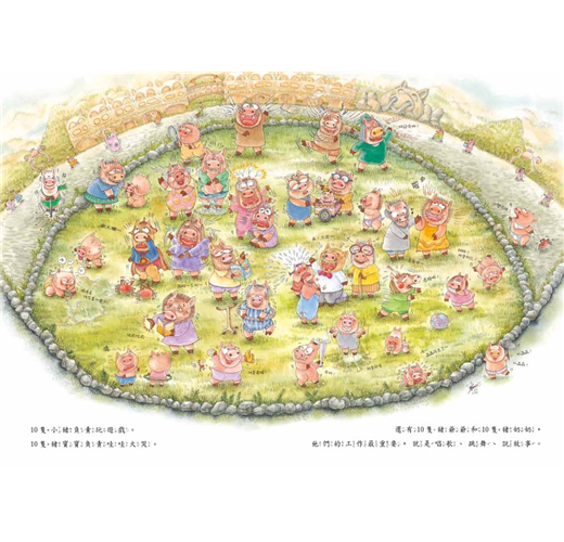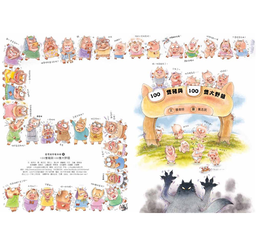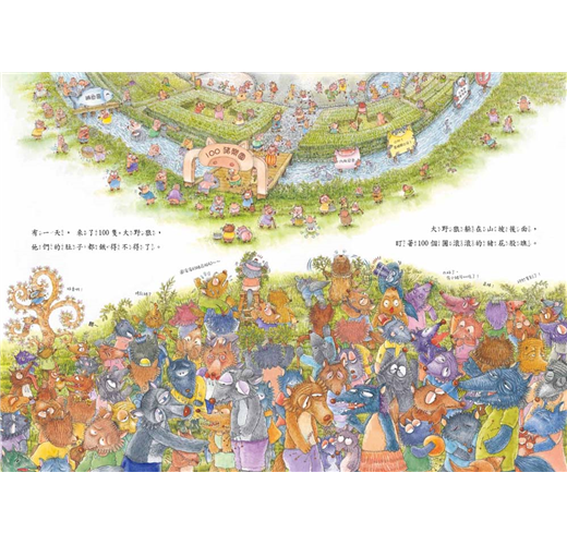 有一天,來了100隻大野狼,這100隻大野狼肚子餓得咕嚕咕嚕叫。他們躲在山坡後面,露出閃閃發光的大尖牙,盯著100個白白嫩嫩的豬屁股瞧……你猜猜,接下來會發生什麼事?是100隻狼吃了100隻豬;還是100隻豬合力趕跑了100隻狼?