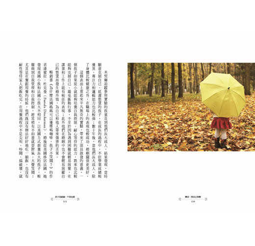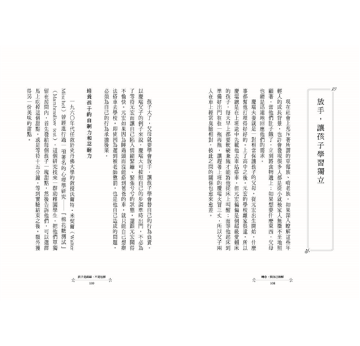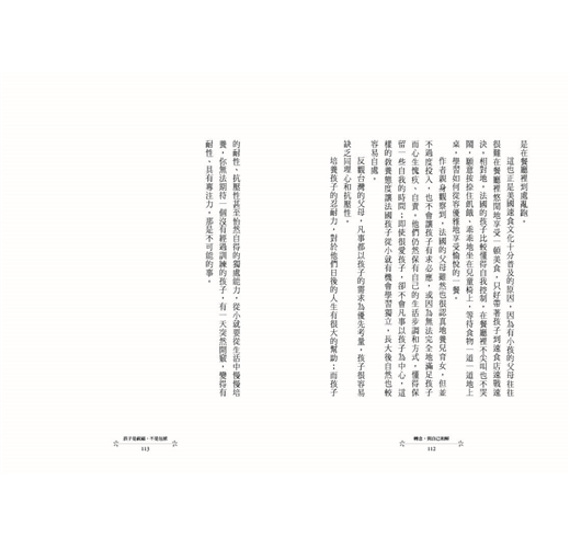 作者親身觀察到,法國的父母雖然也很認真地養兒育女,但並不過度投入,也不會讓孩子有求必應,或因為無法完全的滿足孩子而心生愧疚、自責。他們仍然保有自己的生活步調和方式,懂得保留一些自我的時間;即使很愛孩子,卻不會凡事以孩子為中心,這樣的教養態度讓法國孩子從小就有機會學習獨立,長大後自然也較容易自處。