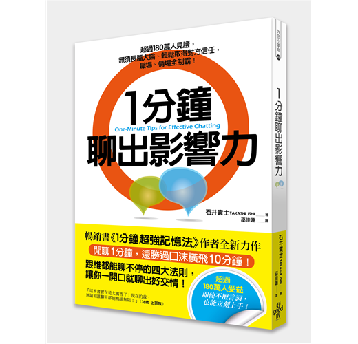 《1分鐘聊出影響力》充滿讓你茅塞頓開的觀點!像是「閒聊的定義就是和對方無關也沒有意義的話」等等,是讓老是反其道而行的我驚嘆不已的一本書!今天開始我也要脫胎換骨,成為閒聊高手,縮短跟暗戀對象的距離!(K.N. 30幾歲醫生)