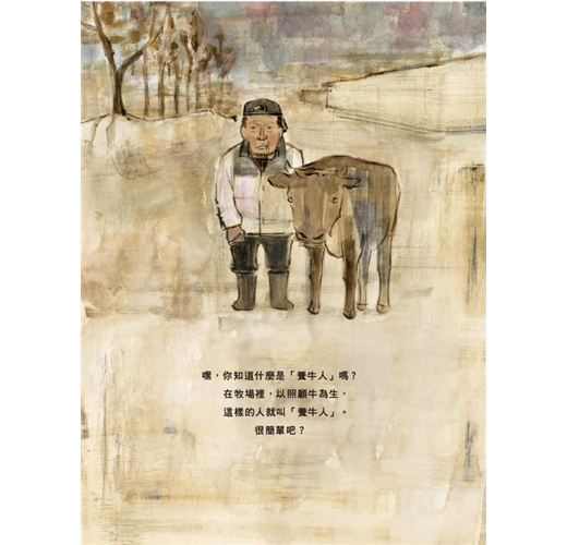 都要在那裡守著留下的牛隻。此繪本所描繪的,便是這位養牛人的姿態。