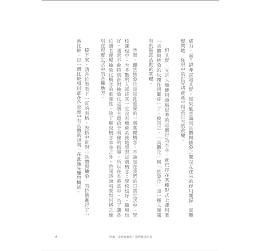 所以當你掌握了抽象化,就等於掌握了思考。但若只有抽象化,不會在抽象與具體之間轉換,與人溝通會容易產生偏見誤解與對立,妨礙人類正常的生活。