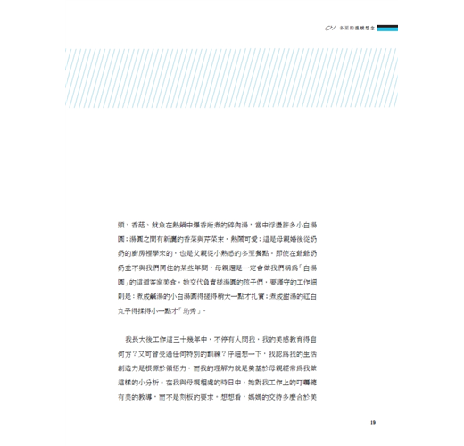 這本書所集結的篇章有些是因為感想而引發的實作,有些是因為實作而歸納出的感受。無論從哪一處開端,兩種都是我生活的實貌:既感謝長輩們的教導有方,也希望能與後生晚輩同享此樂,共蒙此愛。這應是元朝馬端臨撰《文獻通考》中所寫的:「有人斯可教,有教斯可學,自開闢則既然矣。」的實情。