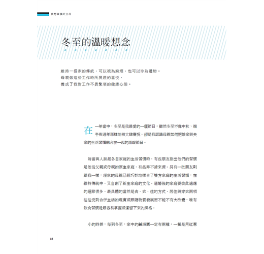 01冬至的溫暖想念 02打扮新年的心情 03 生活傳承 04 孩子在廚房學到的事 05 孩子需要真心誠意的陪伴 06 真正的禮物 07 愛的補習 08熱愛生活就能激發創作與驚喜
