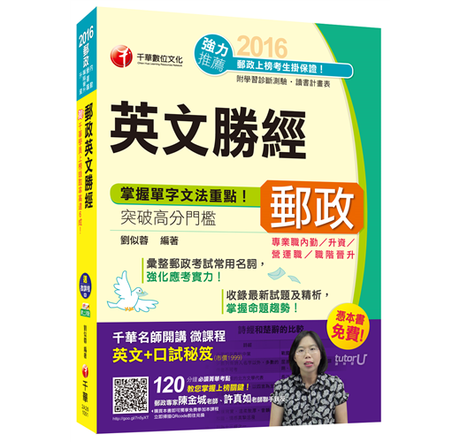 為使考生在郵政考試中獲得高分,編者特別收集郵政相關的常用字彙、英文國名、地名譯寫原則、街道名稱英譯摘錄等,做一統整。也將其中所有曾考過的以及重要的單字、片語、文法、句型、會話、綜合測驗等重新編寫彙整,以方便考生閱讀,強化應考實力。